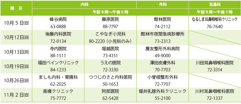 ※館林市夜間急病診療所(【電話】73-2313) 午後7時~10時(内科・小児科。日・祝日除く)