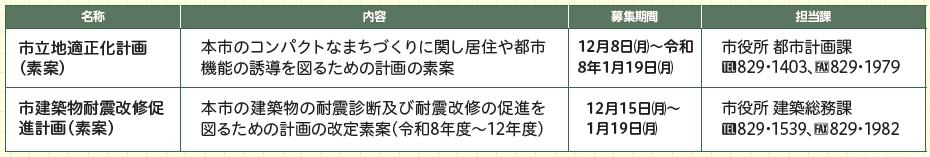 本市では、市民の皆さんの意見を市政に反映させるため、基本的な計画や条例の素案等に対して広く意見を募集するパブリック・コメントを実施しています。