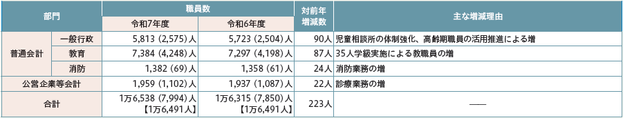 令和7年4月1日現在の職員数は、前年度と比べて223人増の1万6,538人となっています。本市では、多様化する行政需要や職員のワークライフバランスの確保等へ対応するため、総人件費の抑制に配慮しつつ、業務量に応じた適正な職員数を確保することとしています。