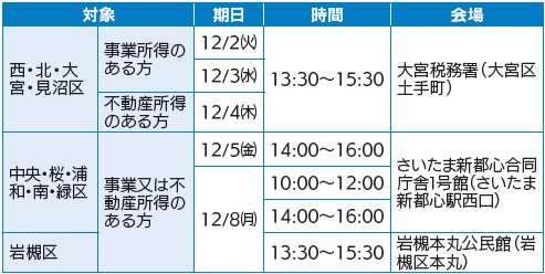 各税務署(浦和【電話】600・5400、大宮【電話】641・4945、春日部【電話】733・2111)