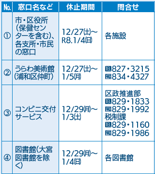 くらし 年末年始の休止・休館のお知らせ 17/59 前の記事 次の記事 発行日 : 2025年12月01日 自治体名 : 埼玉県さいたま市 広報紙名 : 市報さいたま 2025年12月号 ※(1)で出生・死亡・婚姻などの戸籍の届け出は、各区役所の夜間・休日受付窓口で受け付けます。なお、(4)で月曜日が休館日の場合は、1月5日(月)までです。 問合せ:各問合せへ。 Tweet シェアする トピックス お知らせ – 税 トピックス お知らせ – くらし