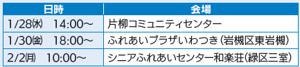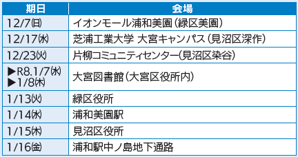 ※いずれも時間は10時~15時です(1月14日(水)・16日(金)は15時~20時)。なお、1月17日(土)以降の開催日等は、市ホームページでご覧になれます。