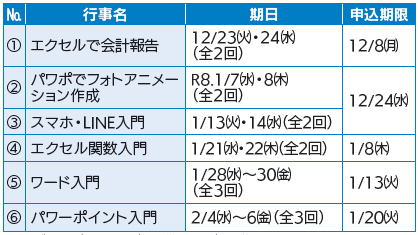 対象:市内在住の60歳以上で、(1)・(4)はエクセル、(2)・(5)・(6)はパソコンの基本操作ができる方