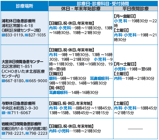 くらし 休日・夜間救急診療 42/52 前の記事 次の記事 発行日 : 2026年02月01日 自治体名 : 埼玉県さいたま市 広報紙名 : 市報さいたま 2026年2月号 ※休日・夜間急患診療所では、休日夜間に緊急で治療が必要な方の診療を行っています。なお、混雑時は診療所駐車場に駐車できないことがあります。 Tweet シェアする 寄付ありがとうございました 在宅当番医
