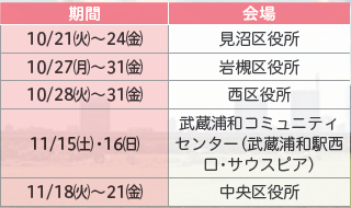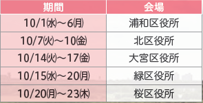 ※各区役所は土・日曜日、祝日を除く、8時30分~17時15分(初日は10時から、最終日は15時まで)、武蔵浦和コミュニティセンターは10時~16時です。