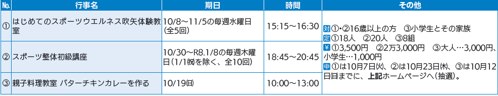 「日」日時、「所」会場、「交」交通、「内」内容、「対」対象、「定」定員、「¥」費用、「託」託児、「申」申込み、「問」問合せ