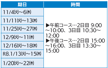 ※いずれも全3回です。なお、1日目はいずれのコースも10時~12時です。