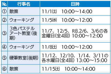 申込み・問合せ:10月28日(火)までに、電話又はファクスで、行事名、氏名、電話・ファクス番号、手話通訳・要約筆記の有無を、みのり園へ(抽選)。