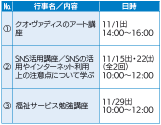 会場・申込み・問合せ:(1)は10月21日(火)、(2)は10月31日(金)、(3)は11月18日(火)までに、電話、ファクス又はEメールで、必須事項と年齢、障害の内容、手話通訳・要約筆記の有無を、障害者総合支援センター(中央区鈴谷)へ(抽選)。