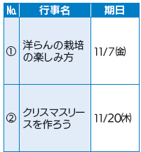 会場・申込み・問合せ:(1)は10月17日(金)、(2)は10月24日(金)(いずれも必着)までに、往復はがき(1人1通のみ)で、必須事項を、〒336-0974緑区大崎3156-1農業者トレーニングセンターへ。