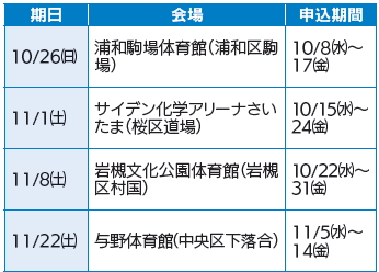 会場・申込み・問合せ:10月9日(木)の12時から、直接又は電話で、浦和西体育館(桜区下大久保)へ。