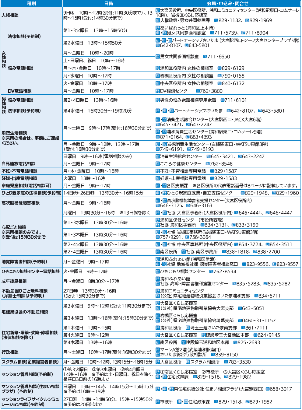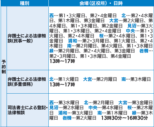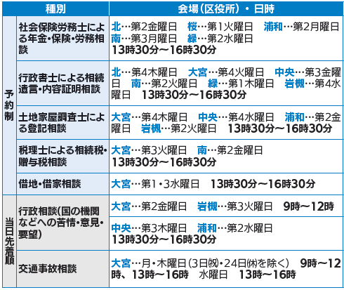 予約制…相談日の40日前〜7開庁日前に、直接又は電話で、各区くらし応援室へ。
