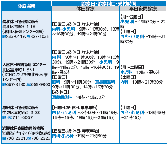 くらし 休日・夜間救急診療 49/59 前の記事 次の記事 発行日 : 2025年10月01日 自治体名 : 埼玉県さいたま市 広報紙名 : 市報さいたま 2025年10月号 ※市内に、休日・夜間急患診療所を開設し、休日や夜間に緊急で治療が必要な方の診療を行っています。発熱している方は、予め電話で受診方法の相談をしてください。 Tweet シェアする 寄付ありがとうございました 在宅当番医