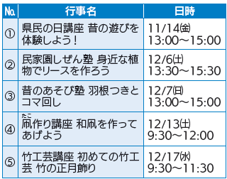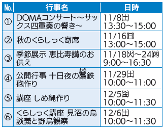 (5)・(6)…(5)は11月21日(金)、(6)は11月15日(土)のいずれも9時から、電話で、見沼くらしっく館へ。