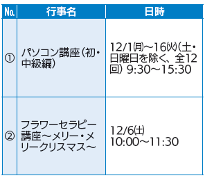 会場・申込み・問合せ:(1)は11月17日(月)、(2)は11月21日(金)までに、電話、ファクス又はEメールで、必須事項と年齢、障害の内容、手話通訳・要約筆記の有無((1)は過去の同講座受講の有無も)を、障害者総合支援センター(中央区鈴谷)へ(抽選)。