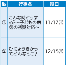 申込み・問合せ:(1)は11月10日(月)、(2)は12月1日(月)(いずれも必着)までに、往復はがき又はEメール(1人1通のみ)で、必須事項と子どもが同伴する場合は人数を、〒336-8522緑区三室2460市立病院患者支援センターへ。