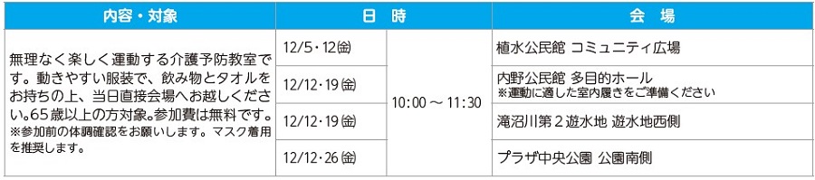 いきいき百歳体操の体験や、口腔(こうくう)ケア、栄養改善、認知症予防などを学ぶ教室です(全6日間)。