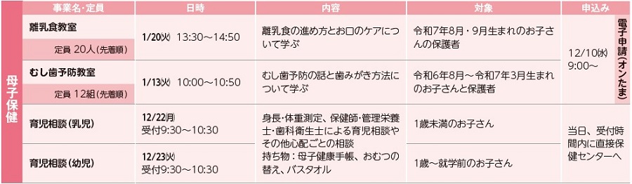 ・母子保健の各教室の参加は、お一人のお子さんに対し1回のみです