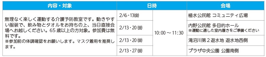 健康 健康応援!いきいきシニア情報 8/17 前の記事 次の記事 発行日 : 2026年02月01日 自治体名 : 埼玉県さいたま市西区 広報紙名 : 市報さいたま 西区版 2026年2月号 ■高齢者すこやか運動教室 ※植水公民館、滝沼川第2遊水地、プラザ中央公園は雨天中止。天候不良時の実施可否は、西区高齢介護課までお問い合わせください。 問合せ:西区高齢介護課 【電話】620・2668【FAX】620・2762 Tweet シェアする 不動産無料相談会 こんにちは区長です