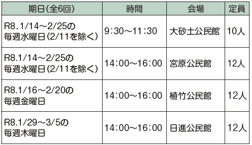 申込み:12月19日(金)までに、北区高齢介護課又は各公民館で配布する申込書に記入し、直接又はファクスで、北区高齢介護課又は会場となる公民館へ。電子申請・届出サービス(オンたま)からも申込みができます。