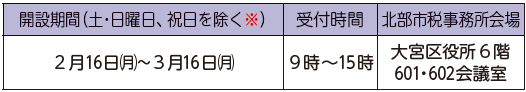 ※ただし、3月1日(日)は北部・南部市税事務所会場のみ開設しております。