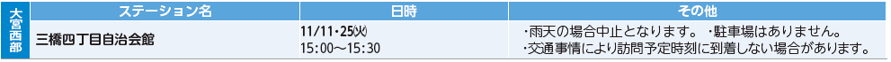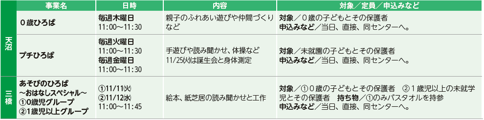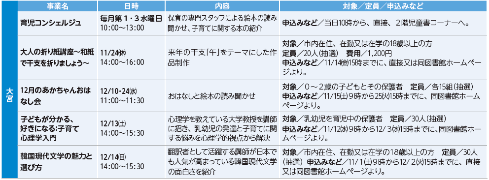 くらし 大宮区インフォメーション 12/19 前の記事 次の記事 発行日 : 2025年11月01日 自治体名 : 埼玉県さいたま市大宮区 広報紙名 : 市報さいたま 大宮区版 2025年11月号 ※費用の表示がないものは無料です。 ※その他のイベントなどについては、市ホームページ又は各問合せ先へお問い合わせください。 ■児童センター 天沼児童センター【電話・FAX】645・7988 三橋児童センター【電話・FAX】644・2978 ■図書館 大宮図書館【電話】643・3701【FAX】648・8460 ■移動図書館 大宮西部図書館【電話】664・4946【FAX】667・7715 ■老人福祉センター あずま荘【電話・FAX】642・1266 Tweet シェアする 福祉まるごと相談窓口を開設しています 区役所の休日窓口をご利用ください(支所・市民の窓口を除く)