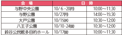 会場の運動遊具などを使用し、簡単な運動を行う教室です。帽子、タオル、飲み物をご持参のうえ、動きやすい服装で、直接会場へお越しください。室内会場は室内用運動靴をご持参ください。