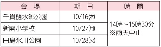 小学校や公園に設置された遊具を使って無理なく運動します。初めて参加する方も、日頃運動をしていない方も大歓迎です。当日、直接、会場へお越しください。