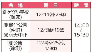 ※1/8(木)の調公園は、公園内施設(ふるさと亭)で実施。