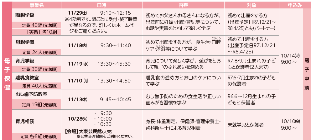 ・母子保健の各事業(育児相談を除く。)の参加は、お一人のお子さんに対し1回のみです。