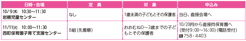 子育て はじめての子育てを応援します 15/21 前の記事 次の記事 発行日 : 2025年10月01日 自治体名 : 埼玉県さいたま市岩槻区 広報紙名 : 市報さいたま 岩槻区版 2025年10月号 子育てが初めての方、転入した方を対象に保育士や保健師などが子育て・遊び・保育園についての相談、情報提供などを行います。 問合せ:区支援課 【電話】790・0162【FAX】790・0266 Tweet シェアする 岩槻区インフォメーション 岩槻区保健センターからのお知らせ