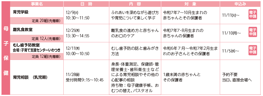 ・母子保健の各教室の参加は、お子さん1人に対し1回のみです。