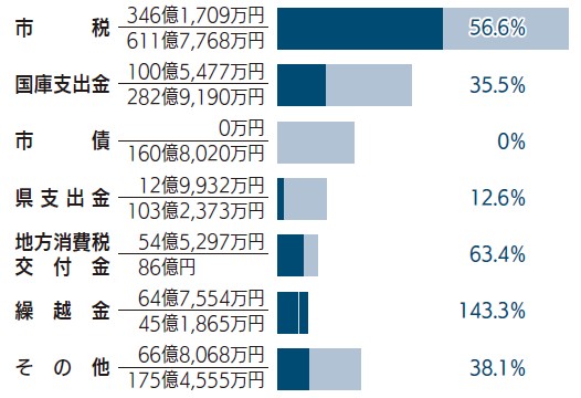 その他…地方譲与税、配当割交付金、法人事業税交付金、地方特例交付金、地方交付税、分担金および負担金、使用料および手数料、財産収入、寄附金、繰入金、諸収入 等