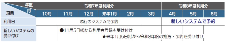 令和8年1月5日(月)から令和8年度分の抽選・予約を新しいシステムで受け付けします。新しいシステムの利用には、利用者登録が必要です(11月5日(水)から受け付け)。なお、現行の予約システムを利用している方も改めて登録してください。