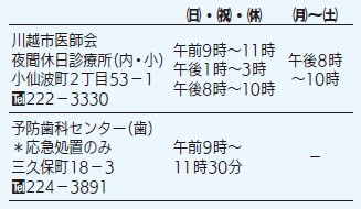 *休日・夜間診療、休日当番医について詳しくは、保健医療推進課にお尋ねください。