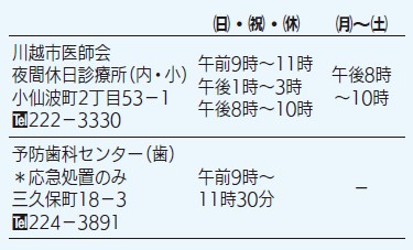 *休日・夜間診療、休日当番医について詳しくは、保健医療推進課にお尋ねください。