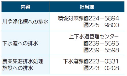 汚水等の流出事故が発生しないよう、下水道への排水の管理や浄化槽の点検・整備を徹底するなど、水質保全にご協力ください。