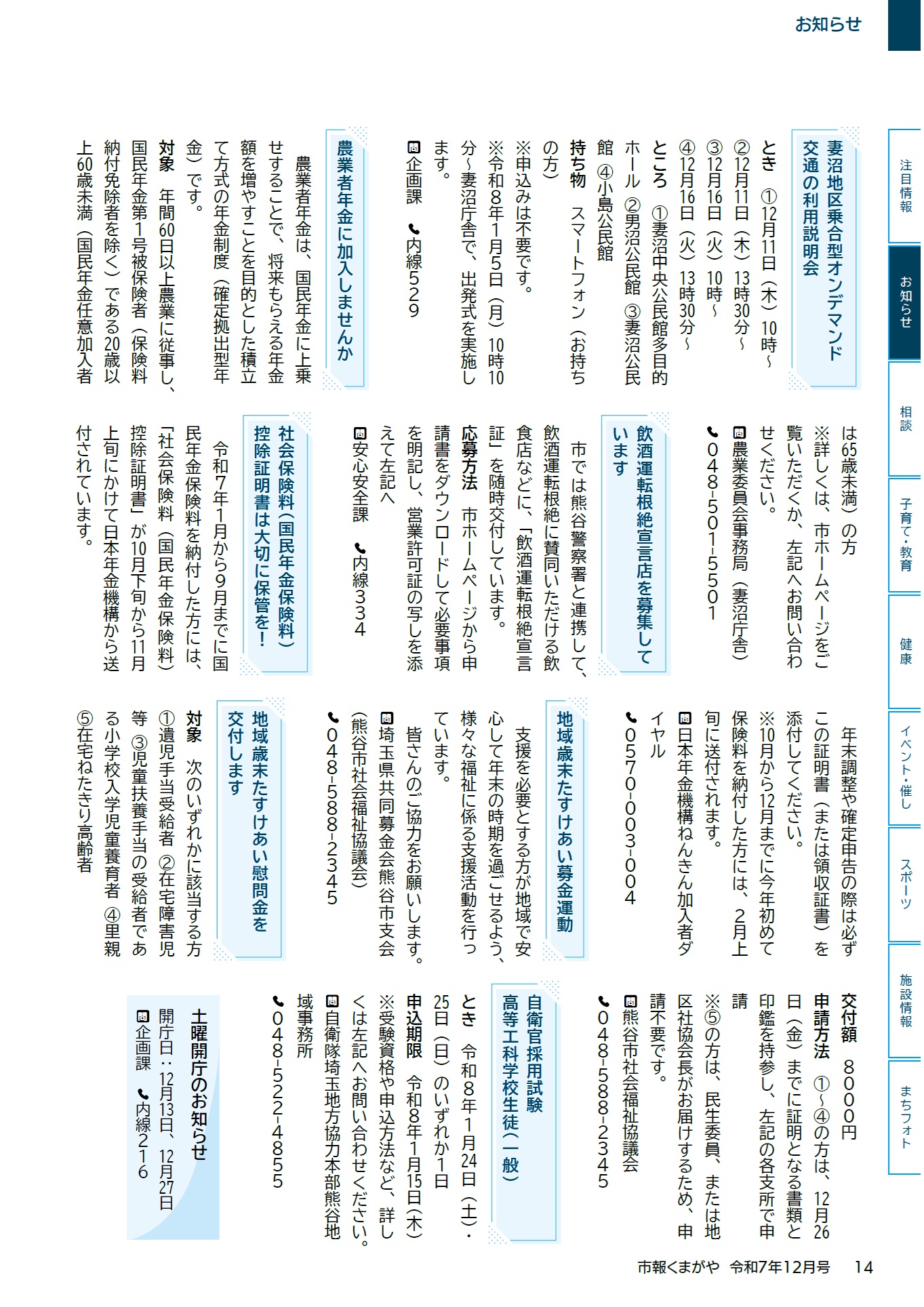 くらし 市報くまがや 2025年12月号 vol.243 P.14 14/32 前の記事 次の記事 発行日 : 2025年12月01日 自治体名 : 埼玉県熊谷市 広報紙名 : 市報くまがや 2025年12月号 vol.243 Tweet シェアする 市報くまがや 2025年12月号 vol.243 P.13 市報くまがや 2025年12月号 vol.243 P.15