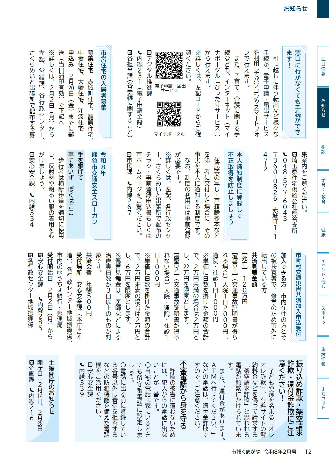 くらし 市報くまがや 2026年2月号 vol.245 P.12 12/32 前の記事 次の記事 発行日 : 2026年02月01日 自治体名 : 埼玉県熊谷市 広報紙名 : 市報くまがや 2026年2月号 vol.245 Tweet シェアする 市報くまがや 2026年2月号 vol.245 P.11 市報くまがや 2026年2月号 vol.245 P.13