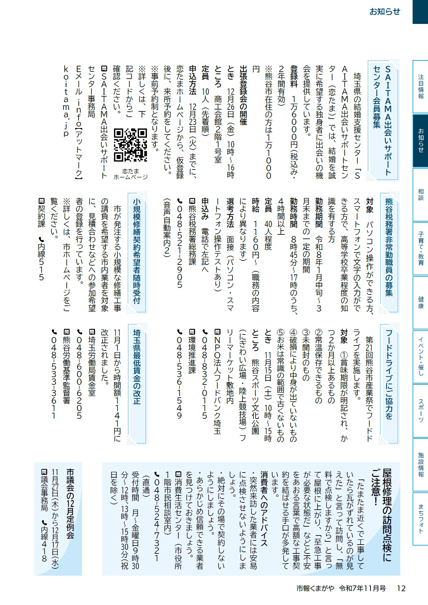 くらし 市報くまがや 2025年11月号 vol.242 P.12 12/32 前の記事 次の記事 発行日 : 2025年11月01日 自治体名 : 埼玉県熊谷市 広報紙名 : 市報くまがや 2025年11月号 vol.242 Tweet シェアする 市報くまがや 2025年11月号 vol.242 P.11 市報くまがや 2025年11月号 vol.242 P.13