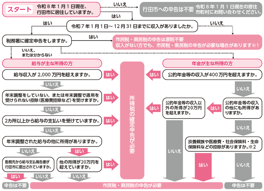 ※1 所得のない方でも、国民健康保険・後期高齢者医療保険などの各種手続きで申告が必要な方や税証明書を必要とする方は、市民税・県民税の申告が必要です。