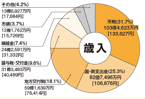 歳入では、定額減税の影響による個人市民税の減少などがあったものの、定額減税による減収を補填するための地方特例交付金や地方交付税の増加などにより、総額では前年度と比較して4億7,250万円増の326億8,521万円となりました。