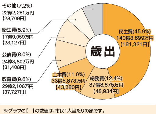 歳出では、新型コロナウイルスワクチン接種事業の縮小などにより衛生費の減少があったものの、民生費において定額減税調整給付金給付事業を開始したことや、土木費において行田市駅跨線橋修繕工事負担金が増加したことなどにより、総額では前年度と比較して7億7,217万円増の305億5,897万円となりました。