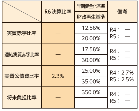 市の財政状況は、実質赤字比率などの4つの統一的な指標で判断されます。これらの指標は財政の早期健全化や財政再生の必要性を判断するものであるとともに、他団体と比較することで財政状況を客観的に表すために用いられます。なお、行田市では全ての指標において早期健全化基準を下回っています。