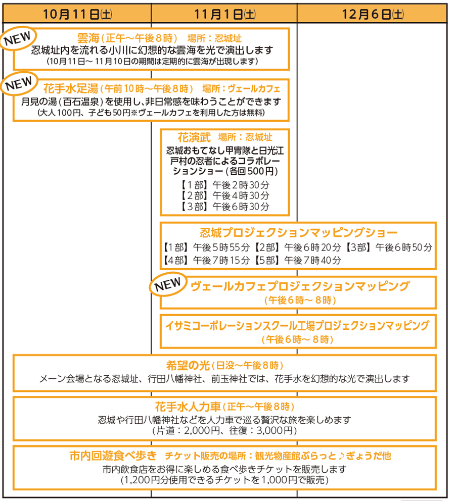 忍城、ヴェールカフェ、イサミコーポレーションスクール工場の3ヶ所でプロジェクションマッピングショー