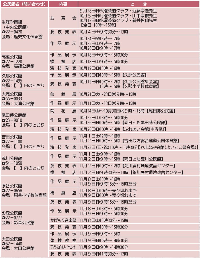 イベント 秩父市公民館文化祭 31/56 前の記事 次の記事 発行日 : 2025年09月10日 自治体名 : 埼玉県秩父市 広報紙名 : 市報ちちぶ 令和7年9月号 公民館で活躍している皆さんが、趣向を凝らした作品展や演技発表を開催しています。 受講生の皆さんの日ごろの成果をご覧ください。 ※内容の詳細は、各公民館へお問い合わせください。 Tweet シェアする 消費生活センターからのお知らせ 夢をかなえる 未来にはばたく 秩父地域の高校