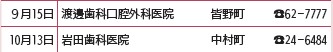 くらし 秩父郡市歯科医師会 48/56 前の記事 次の記事 発行日 : 2025年09月10日 自治体名 : 埼玉県秩父市 広報紙名 : 市報ちちぶ 令和7年9月号 ■〔初期救急医療〕応急処置 ◇当番歯科医療機関 診療時間:10時~13時 必ず電話で確認の上受診してください。 ※診療費用は通常の保険診療扱いとなるため、保険証をご持参ください。 Tweet シェアする 秩父郡市医師会 埼玉県精神科救急情報センター