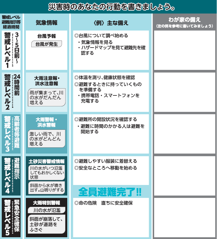 大雨による洪水や土砂災害発生の恐れが高まった時に、命を守るための行動をまとめておく、自分自身の避難計画です。「いつ、誰が、何をするか」を具体的に決めておくことで、避難行動の遅れや混乱を防ぐことができます。