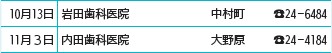 くらし 秩父郡市歯科医師会 43/51 前の記事 次の記事 発行日 : 2025年10月10日 自治体名 : 埼玉県秩父市 広報紙名 : 市報ちちぶ 令和7年10月号 ■(初期救急医療)応急処置 ◇当番歯科医療機関 診療時間:10時~13時 必ず電話で確認の上受診してください。 ※診療費用は通常の保険診療扱いとなるため、保険証をご持参ください。 Tweet シェアする 秩父郡市医師会 埼玉県精神科救急情報センター