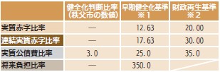 地方公共団体が、財政状況が悪化した状況において、自主的かつ計画的にその財政の健全化を図るべき基準として、実質赤字比率、連結実質赤字比率、実質公債費比率および将来負担比率のそれぞれについて定められた数値です。